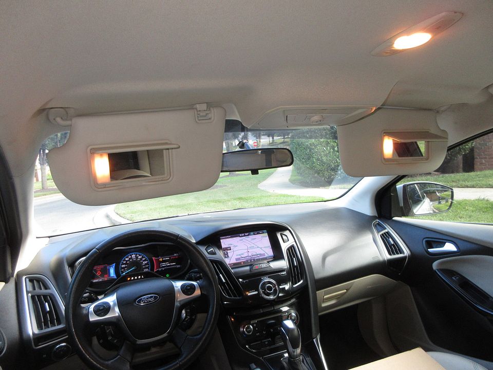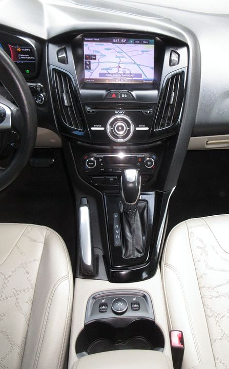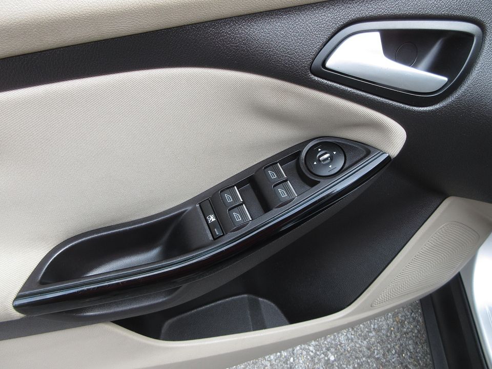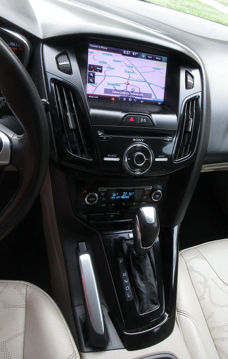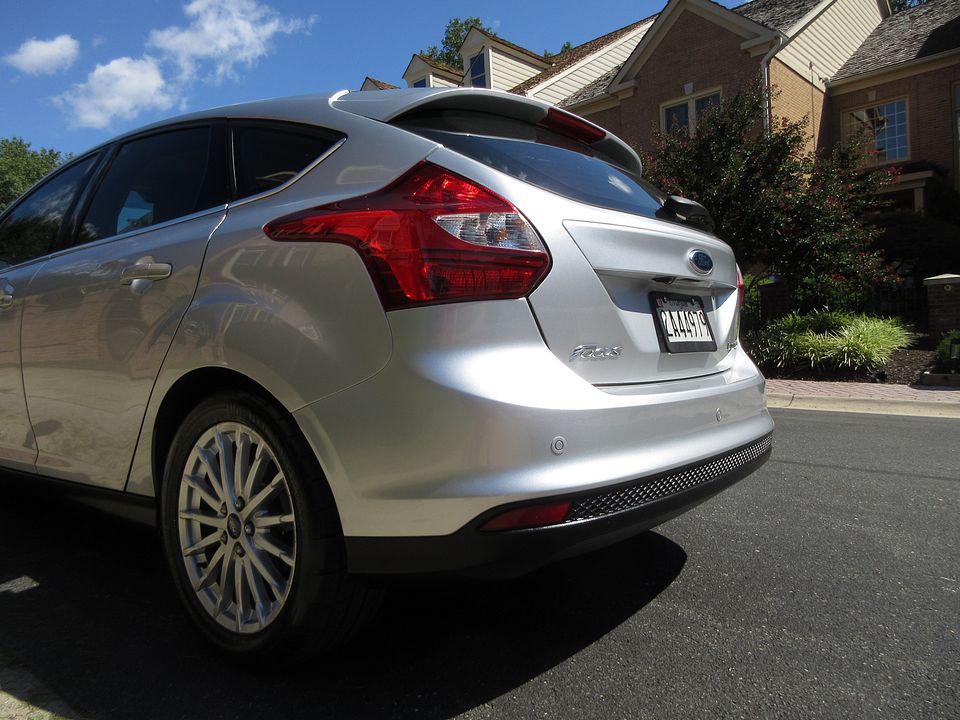 The Ford Focus’s exterior look is upscale and attractive, with front-end styling having more than just a passing resemblance to Aston Martin models of that era. No doubt influenced from Ford’s previous ownership of the brand in the not too distant past. CLICK HERE for an Aston Martin picture to see the resemblance. From its sleek lines and flowing curves incorporating elements from premium European sports cars, it looks handsome from any angle without being flashy. A quick walk around the car reveals how the Focus is one of the more stylish vehicles ever created in the compact class of automobiles. Start up front at the bumper with its short narrow nose containing a trapezoid shaped upper grille with bright aluminum ribs and a matte black lower grille below it. (Think Aston Martin here.) The lower grille is surrounded by aerodynamic strakes facing forward and spats molded in to the sides of the bumper. The hood has a curved notch at the front highlighting the Ford blue-oval emblem, while cats-eye clear lens projector beam headlights flow back from the bumper along the hood. The hood itself has two step-down creases to meet the fender, which themselves have a feature line originating from the bumper and going rearward into the doors for flared muscular look. Next, a steeply raked windshield meets the roof and the feature line coming from the fender fades away at the front of the door, while a second one below it starting from the rear of the fender, continues rearward. Body colored door handles and mirror caps give a monochromatic look. The mirrors incorporate chic euro style LED secondary turn signal lights (repeaters). The beautiful 15-spoke aluminum wheels shod with low profile tires, add visual appeal. Then, going back, the cars’ lines meld into the tailgate with a body color spoiler at the top behind the Eurostyle shorty antenna on the roof. On both sides, large LED taillights provide excellent visibility for following drivers, as do the reflectors in the bumper. A matte black diffuser under the bumper aids aerodynamics while the mesh design accentuates the look.